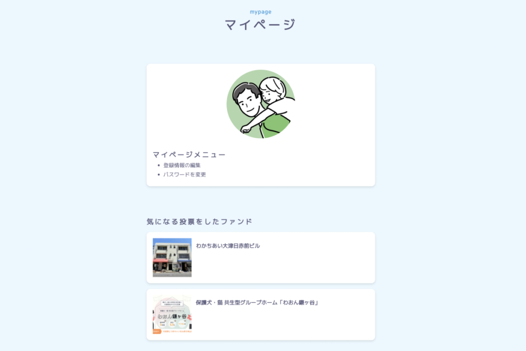 「ファインディングファンド」に会員登録することで、マイページ機能が解放されます。マイページではユーザー情報の編集ができるほか、ファンド詳細で「気になる」ボタンを押すと、そのファンドの情報をマイページにストックすることができます。