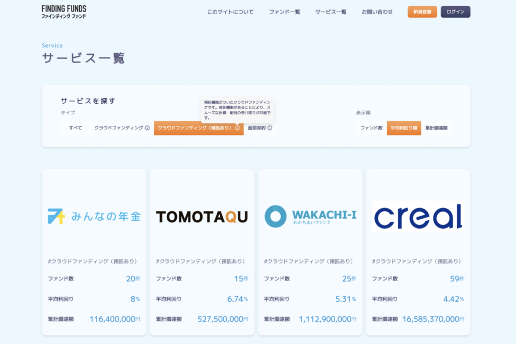 「ファインディングファンド」は、できるかぎり多くの不動産型クラウドファンディングを網羅することで、投資家の方が見つけたいファンドに出会えるようにするためのサービスです。