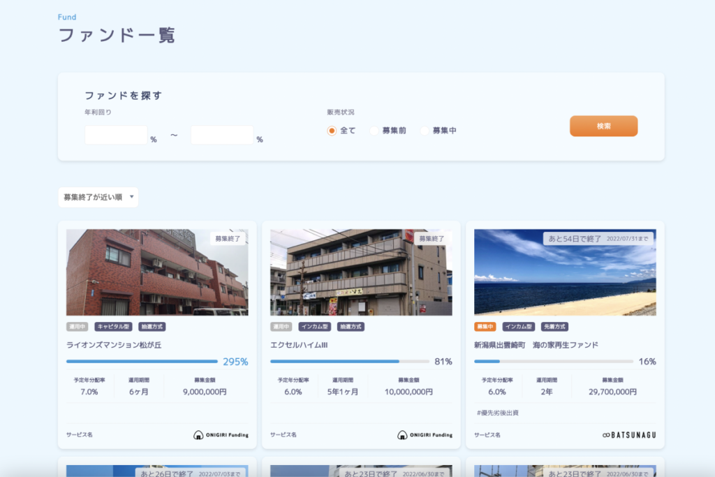 「ファインディングファンド」は、不動産クラウドファンディングで販売されているファンドを横断検索することができます。