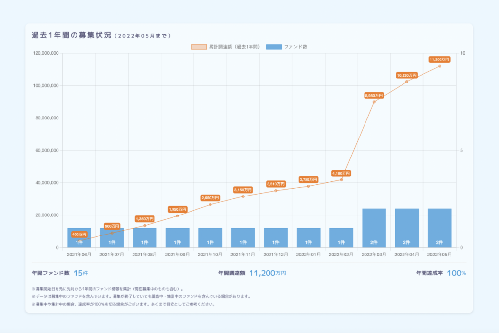 各事業者が運営している不動産クラウドファンディングの運営状況を客観的に見ることができます。累計調達額やファンド件数、運営会社の情報などが見れるほか、過去1年間に実施したファンドの件数、調達状況をグラフ化することで、サービスの運営状況を可視化しています。